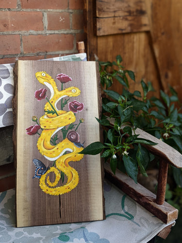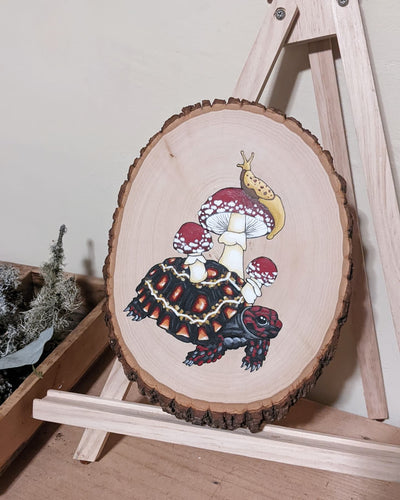Whimsical paintings on beautiful pieces of wood.
